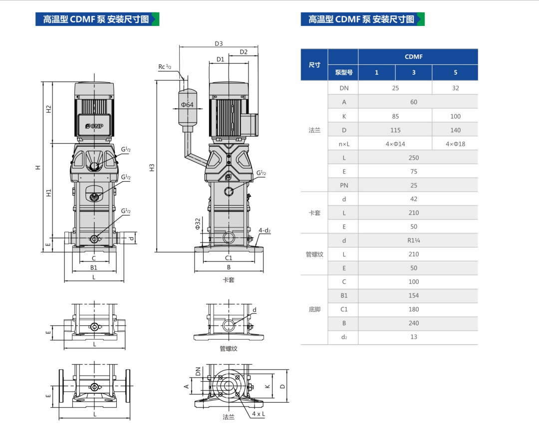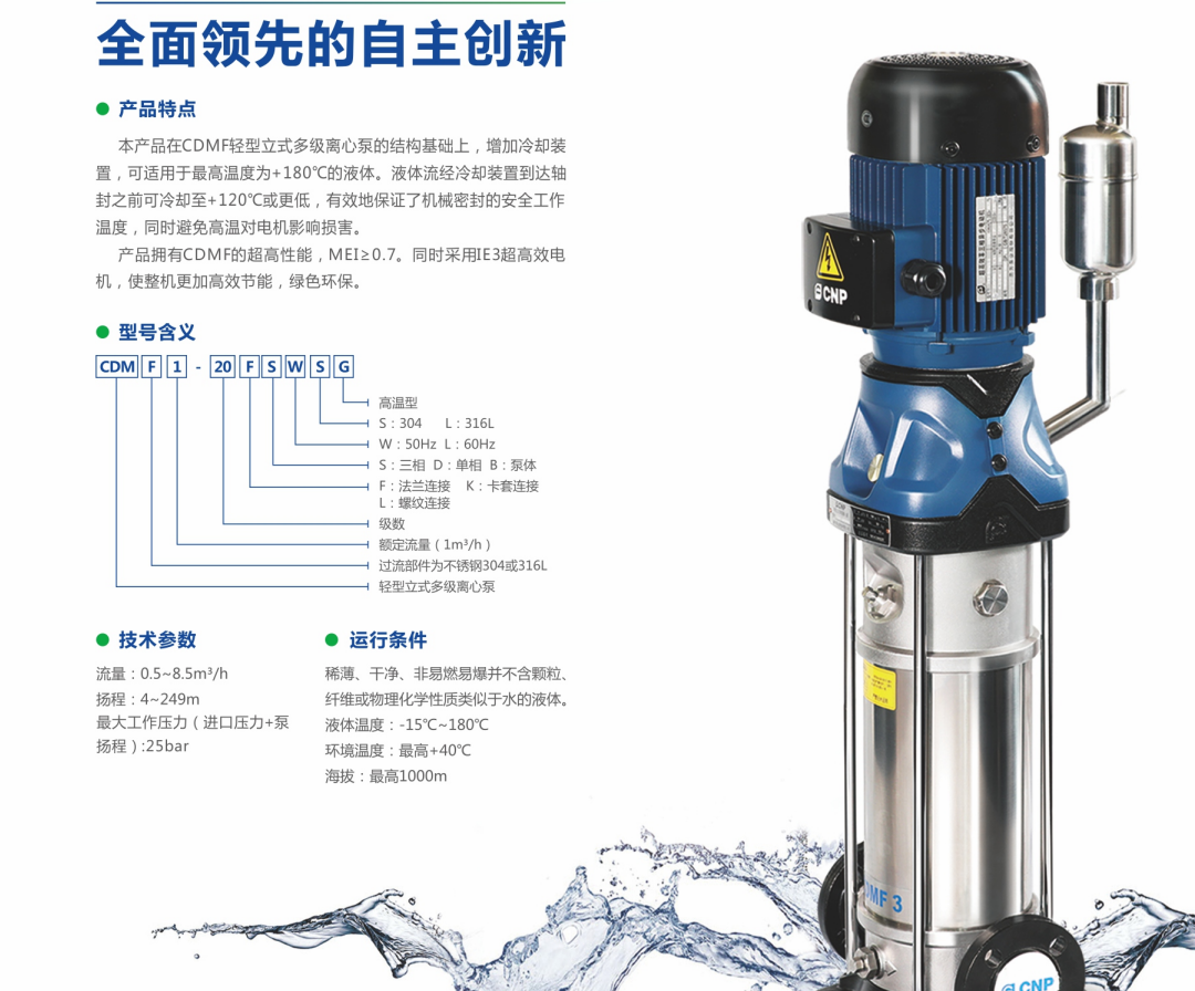本產品在CDMF輕型立式多級離心泵的結構基礎上,增加了冷卻裝置,適用于最高溫度為+180℃的液體。液體流經冷卻裝置到達機封腔處可冷卻至+120℃或更低,有效保證機械密封的安全工作溫度,同時避免高溫對電機的損害影響。