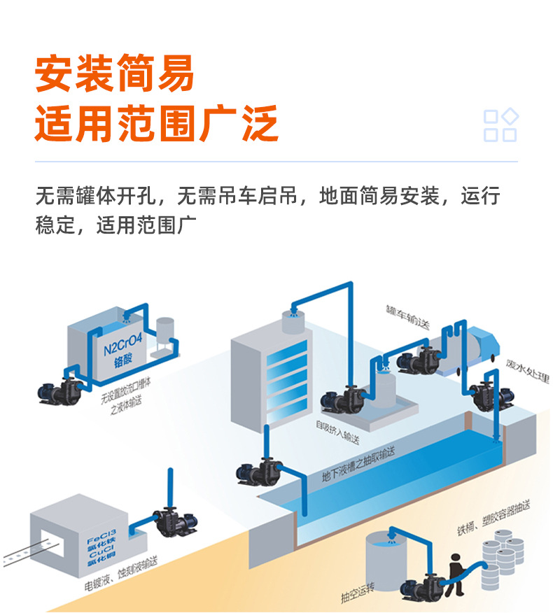 電鍍、化工、農藥、任何強腐蝕性液體的輸送、石油、酸洗